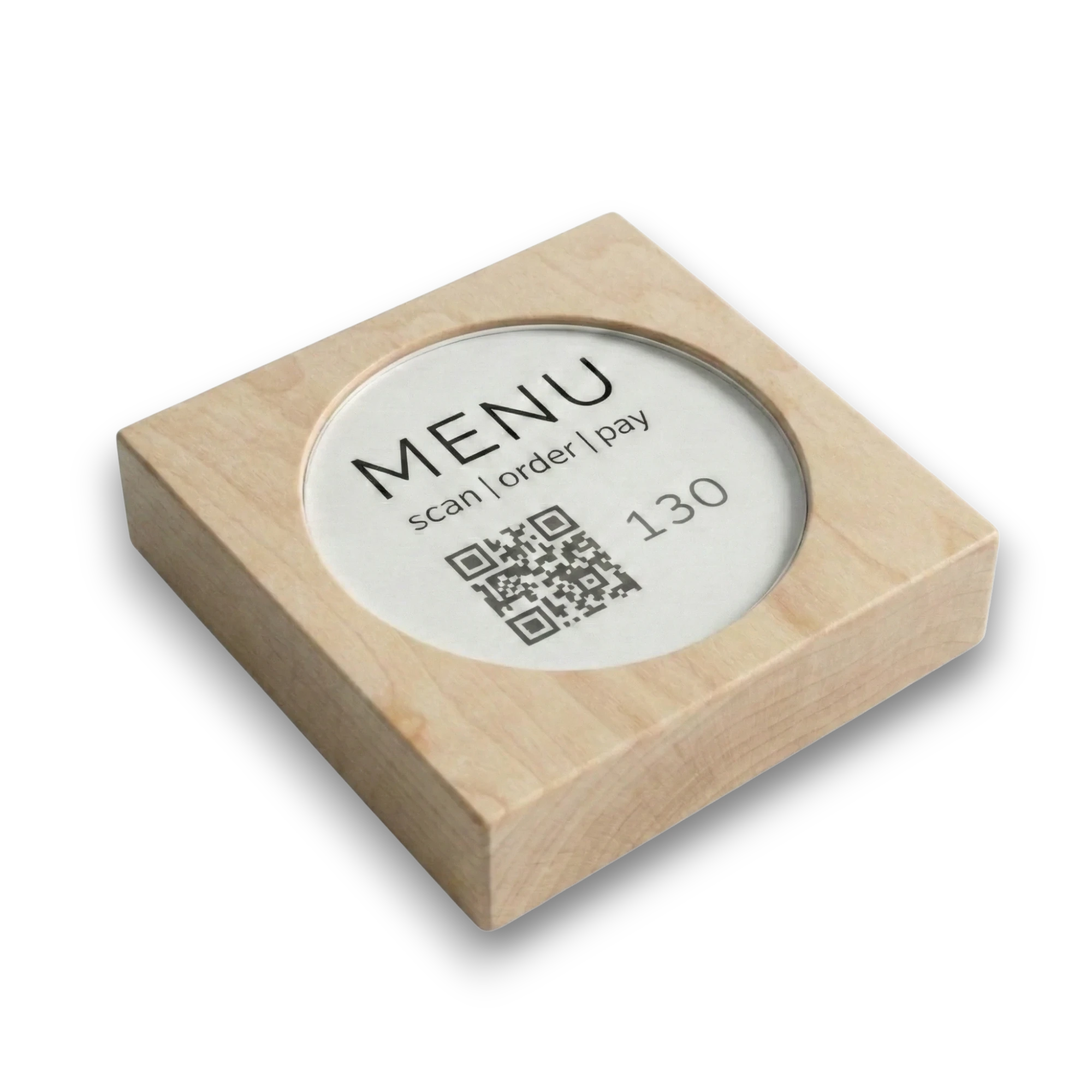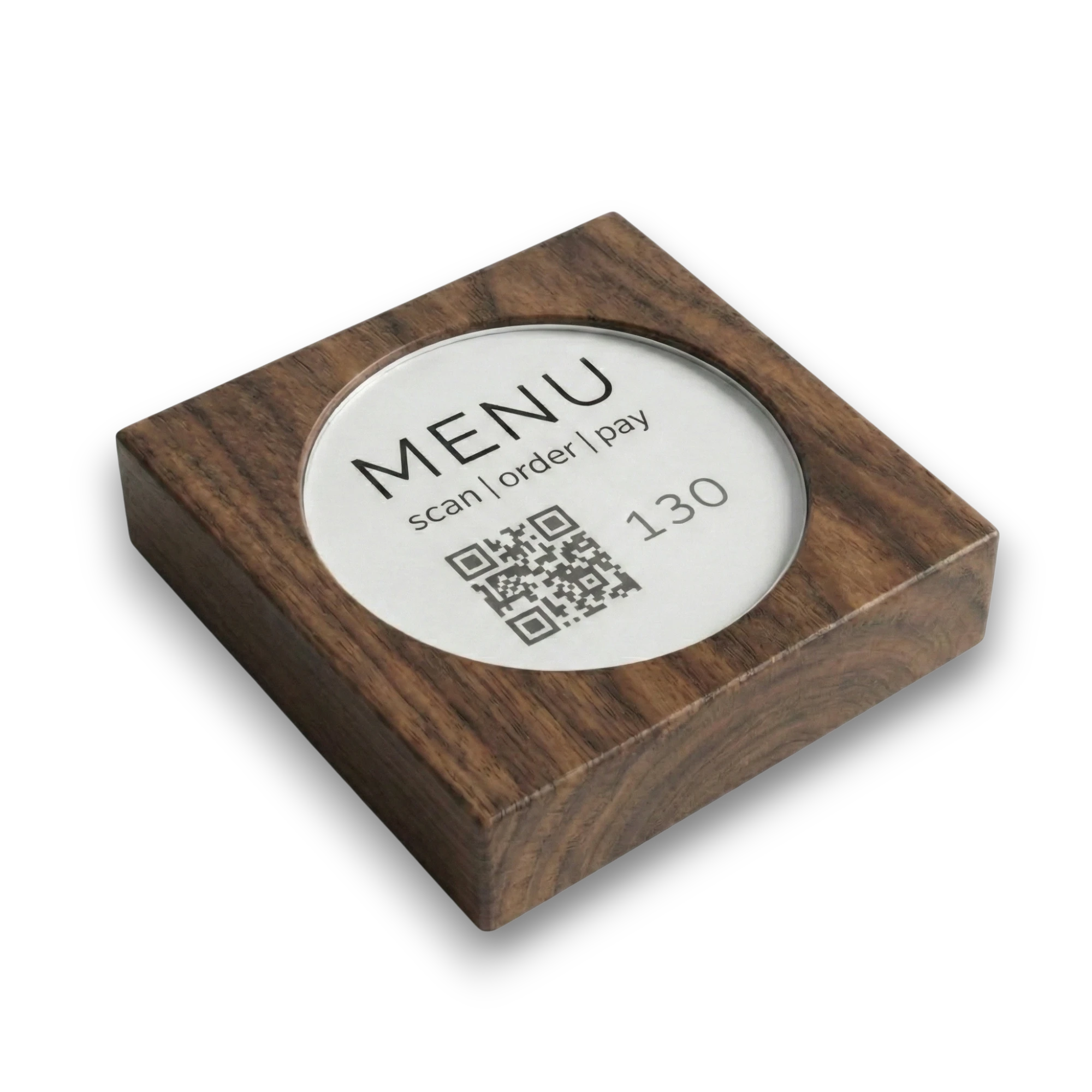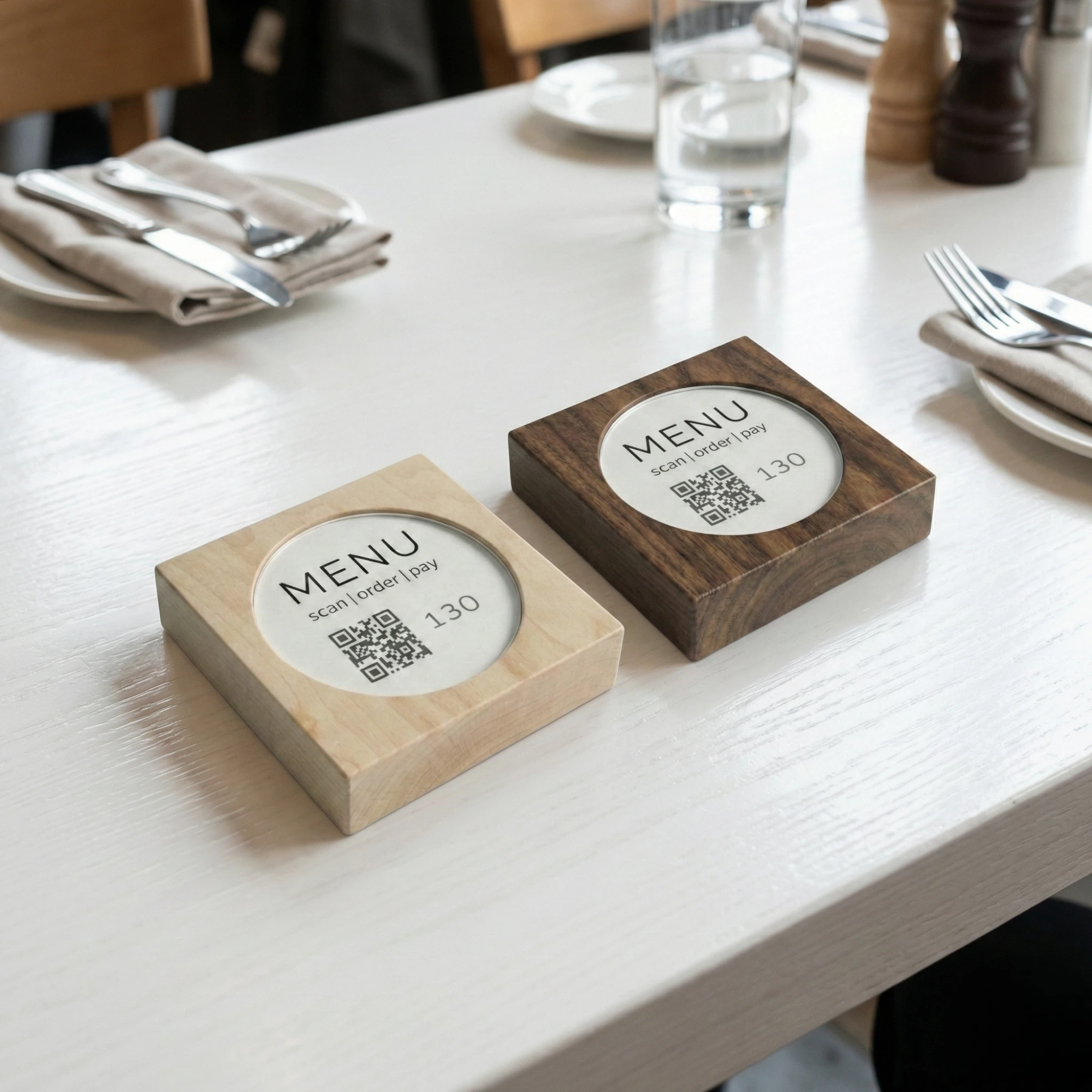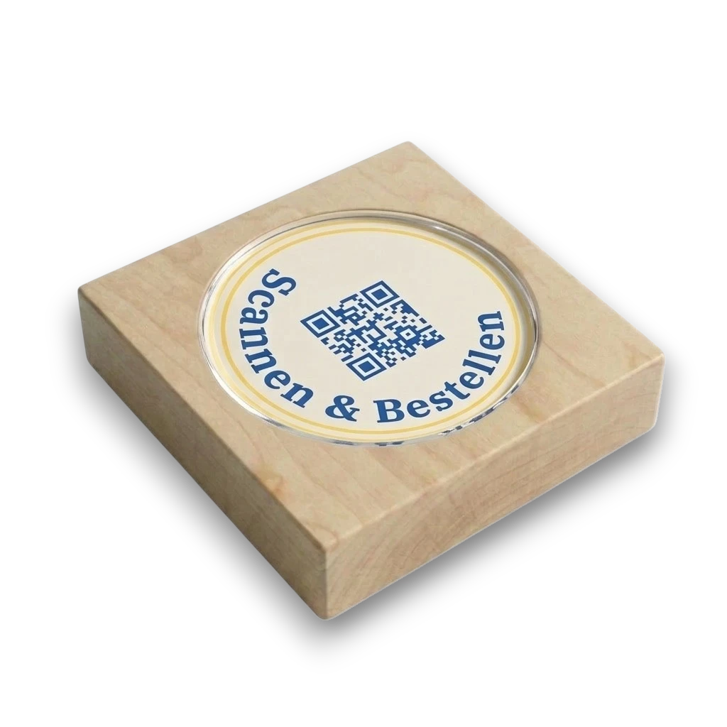 Unsere Touchpoints aus Holz eignen sich perfekt für den Innen- und Außenbereich. Sie sind flexibel auf den Tischen platzierbar und können leicht gereinigt werden. Das Inlay ist zum Schutz vor Feuchtigkeit hinter eine Acrylglasscheibe gefasst.
