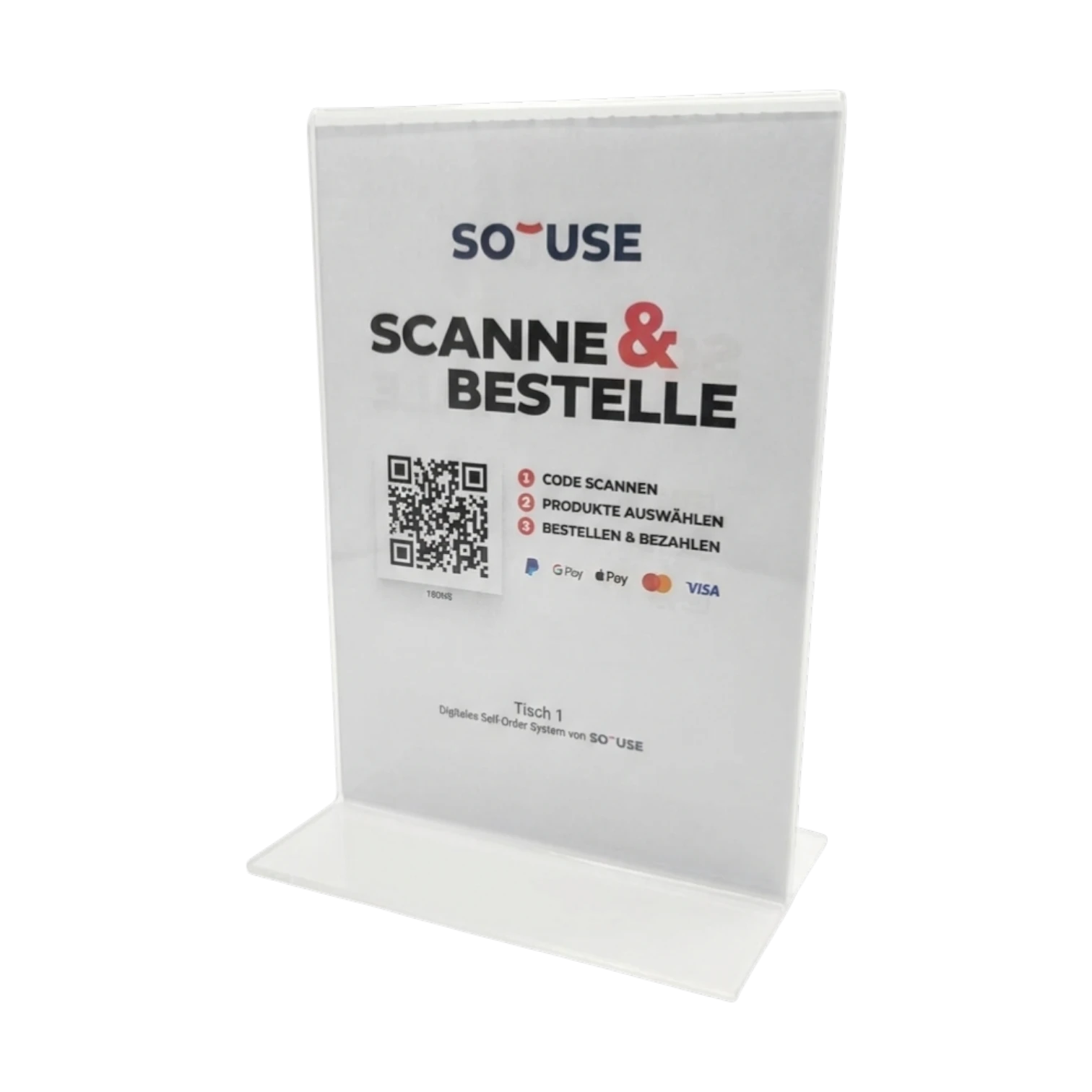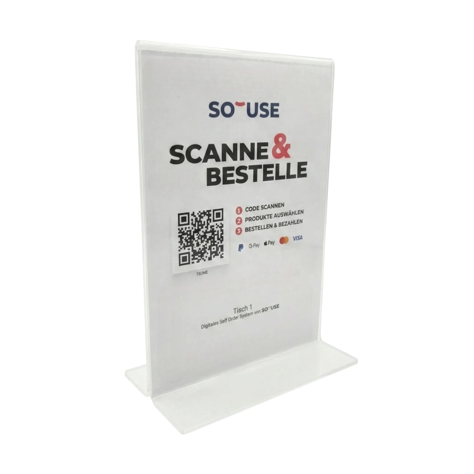 Mach deinen Gastraum smart. Mit diesem hochwertigen T-Aufsteller aus kristallklarem Acrylglas verwandelst du jeden Tisch in einen digitalen Point-of-Sale. Er ist die perfekte Hardware, um deinen Gästen den QR-Code für dein Self-Ordering-System, deine digitale Speisekarte oder Google-Bewertungen direkt vor die Nase zu setzen – unaufdringlich, aber nicht zu übersehen.
