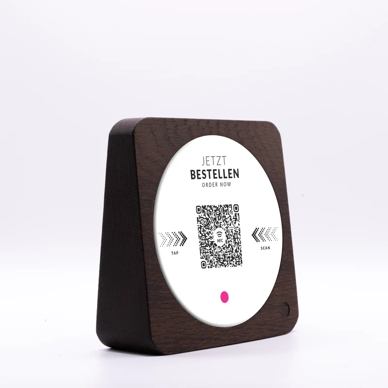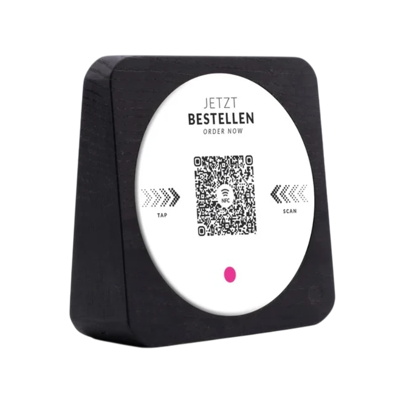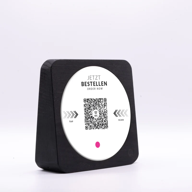 Der runde Aufkleber mit 80 mm Durchmesser und glänzender Oberfläche wurde speziell für den professionellen Einsatz in der Gastronomie entwickelt. Als Standarddesign ist er in der Regel schnell verfügbar und sofort einsatzbereit. Der integrierte QR-Code sowie der enthaltene NFC-Chip ermöglichen Gästen einen direkten Zugriff auf Ihr Bestell- und Bezahlsystem. Per Scan oder einfachem Tap mit dem Smartphone öffnet sich der Inhalt sofort und ohne zusätzliche App.